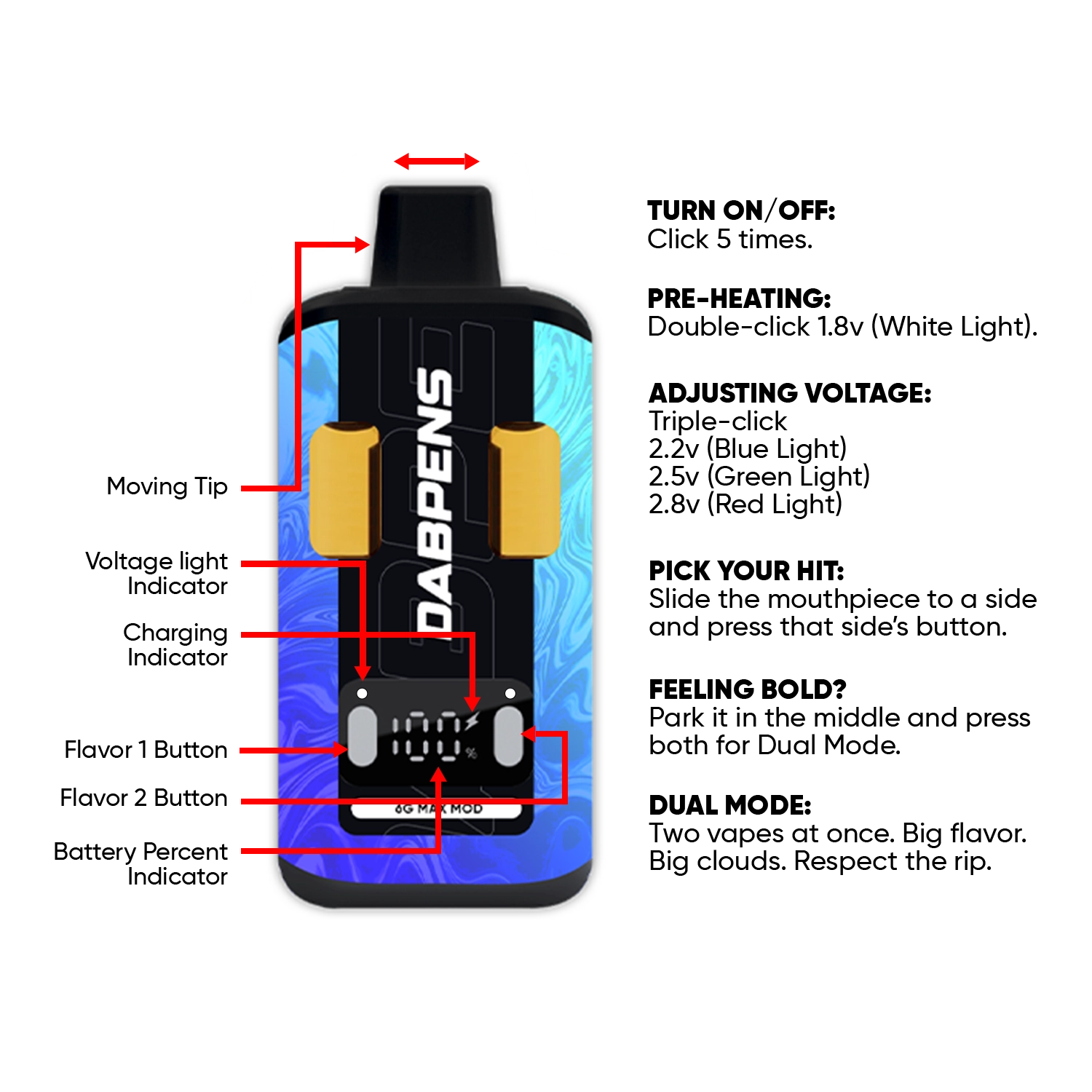 • Dual-flavor vape with adjustable settings